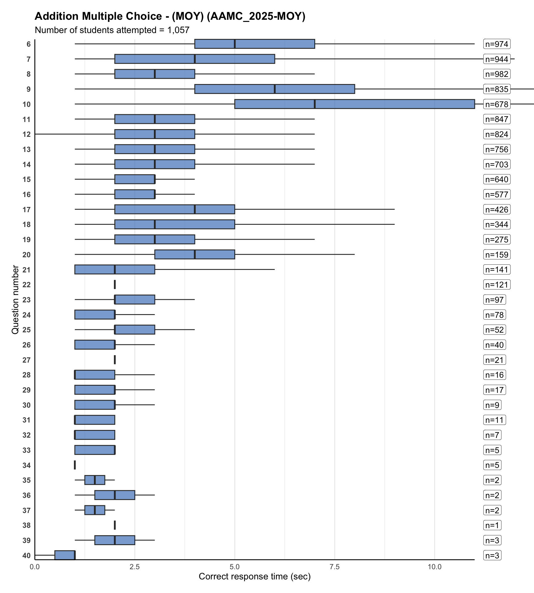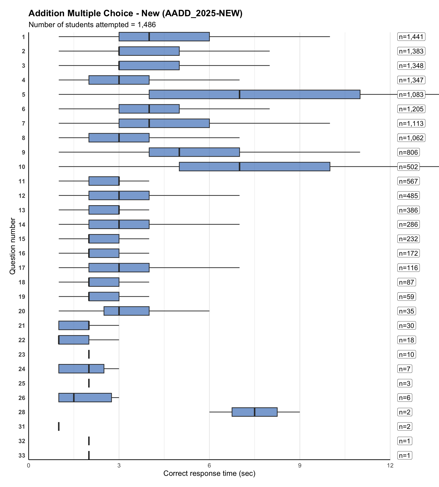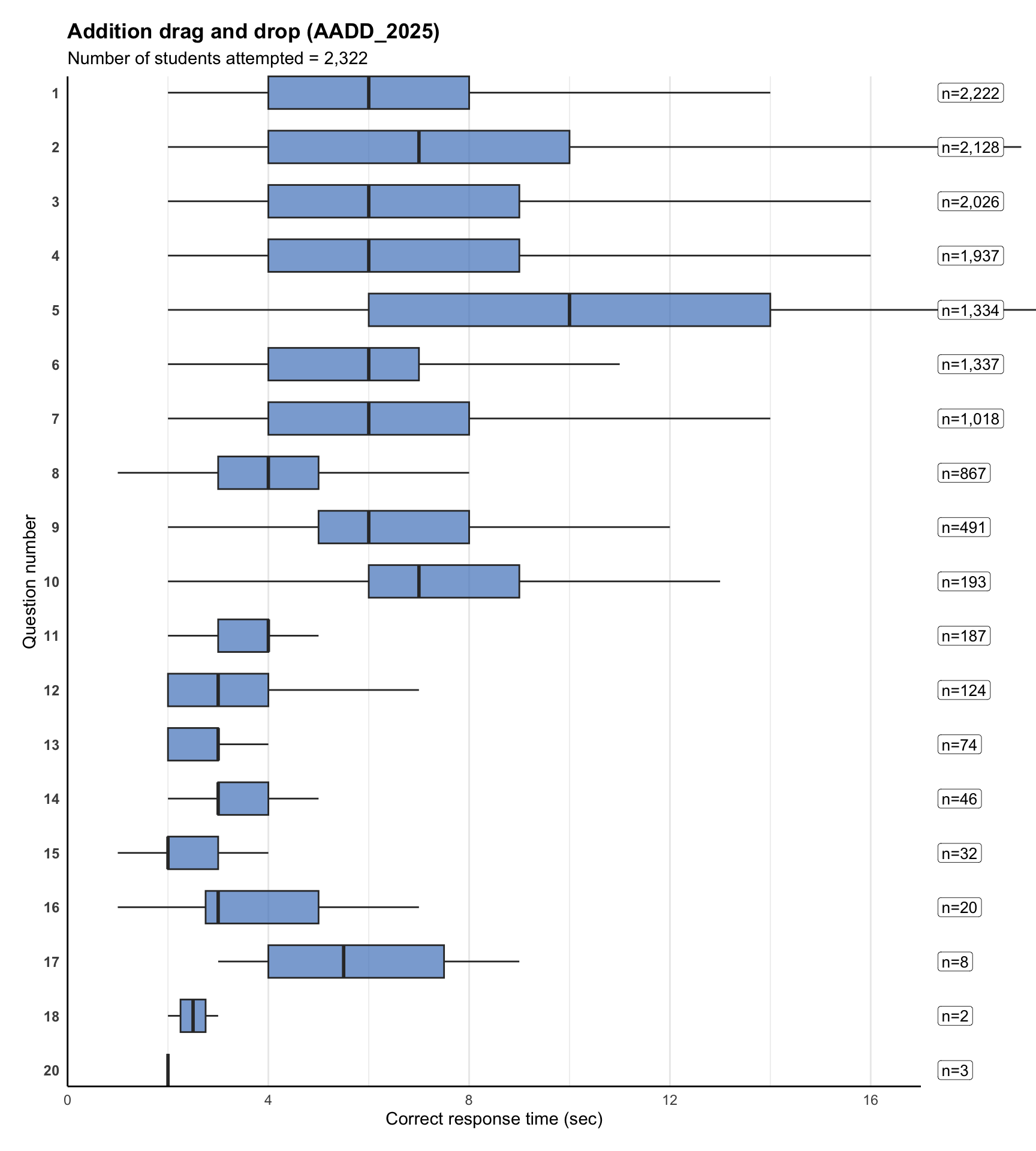 In Term 1 (BOY), students answered by dragging and dropping the correct number (0–13) into the answer box. Because response times were slow at BOY, the task was changed in Term 3 (MOY) and Term 4 (EOY) to a multiple-choice format: students selected the correct answer from four options, with distractors generated from the most common BOY incorrect responses. As a result, the separate “speed test” used to familiarise students with the response format was no longer required at MOY/EOY.