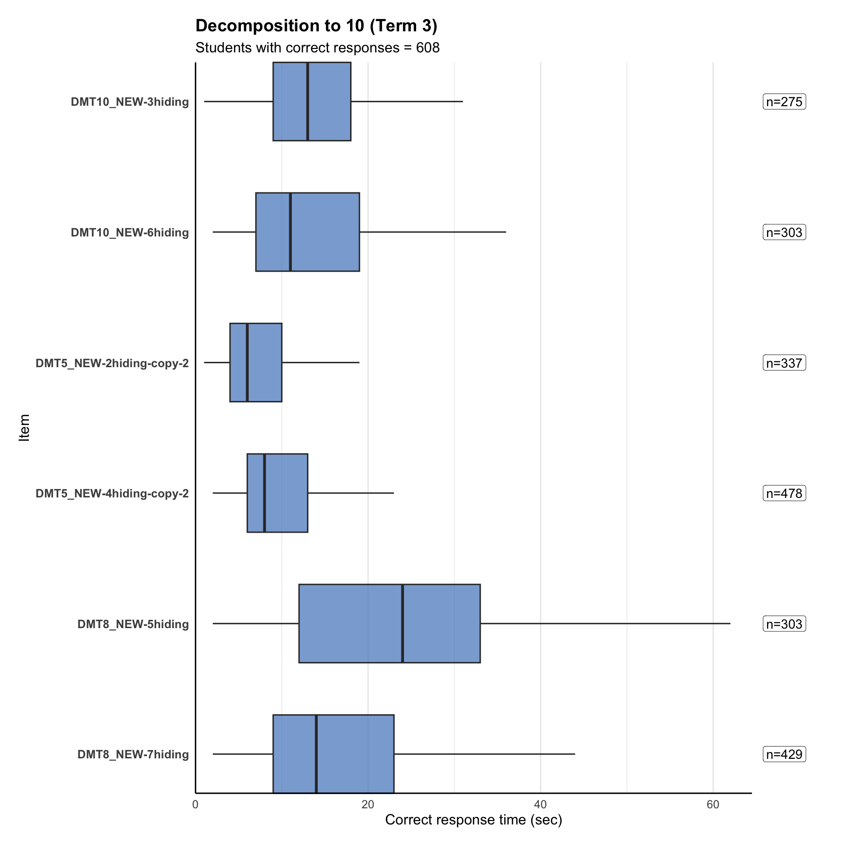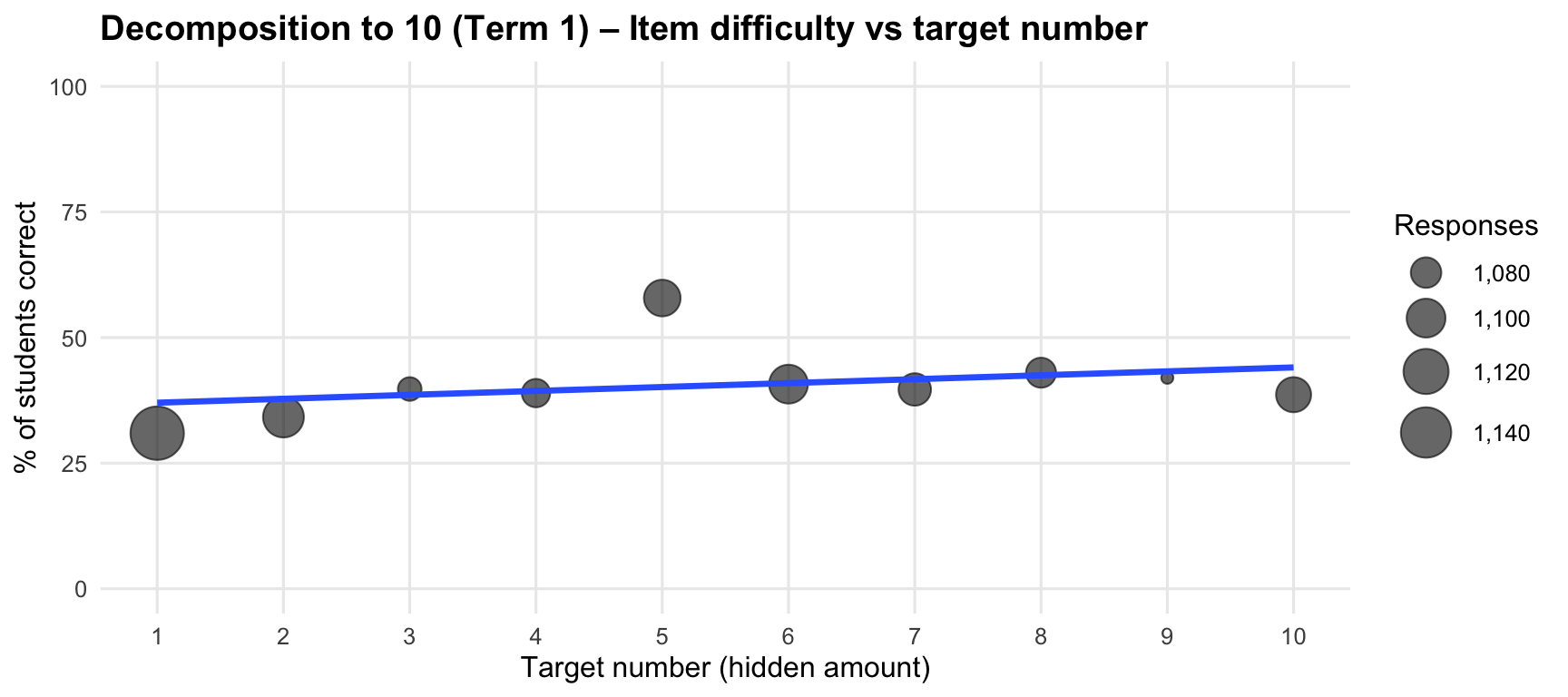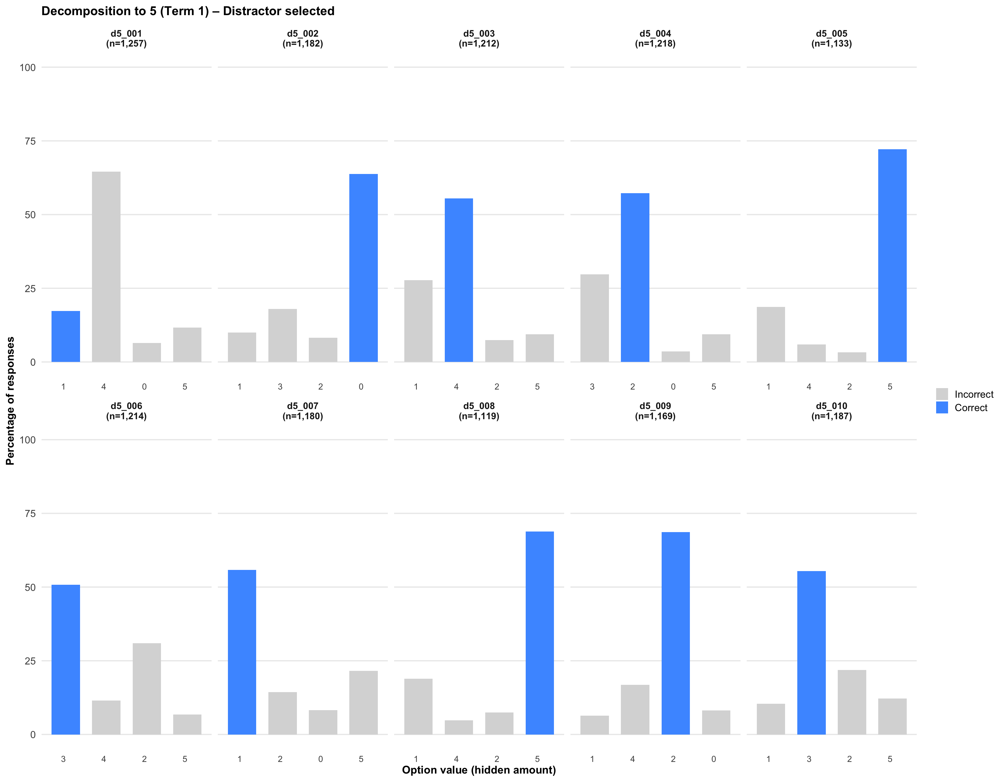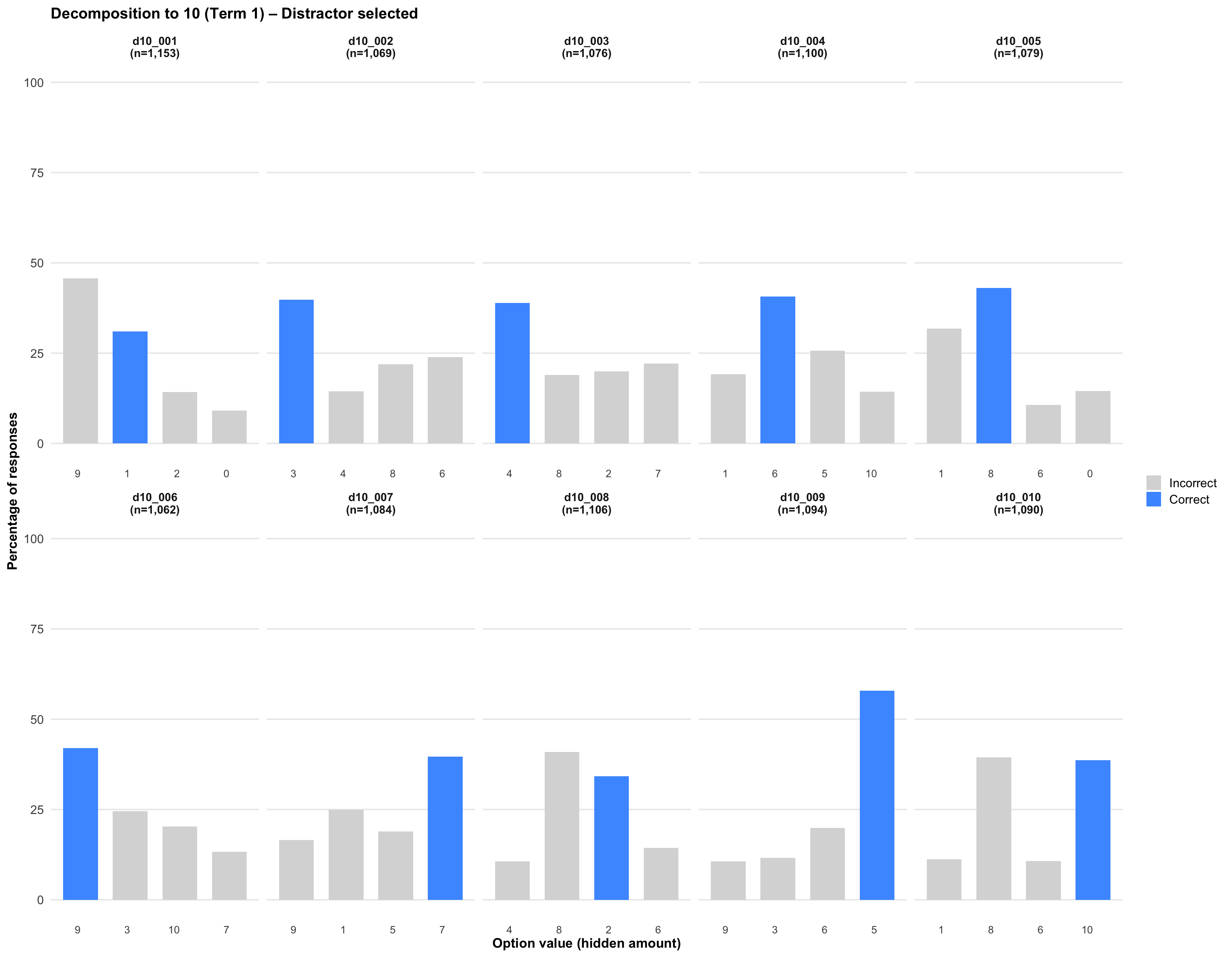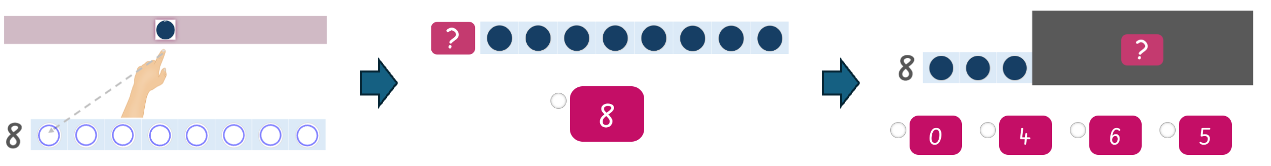 The Decomposition probe assesses students’ understanding of part-whole relationships with numbers. Students are shown a total quantity with some hidden, and must identify how many are hidden. Students select their answer from 4 multiple-choice options (numbers).
