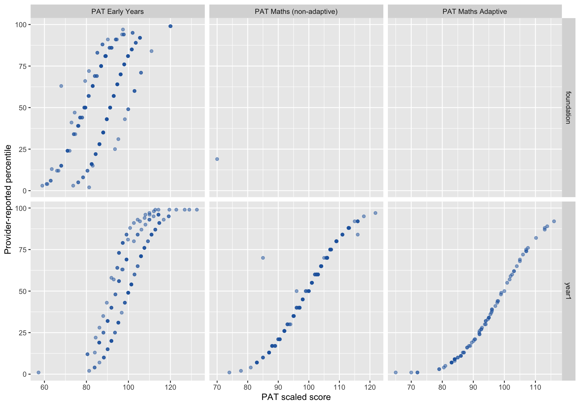 | PAT Maths (non-adaptive), Year 1 | Percentile ≤ 25 | Monotonic score-percentile relationship |