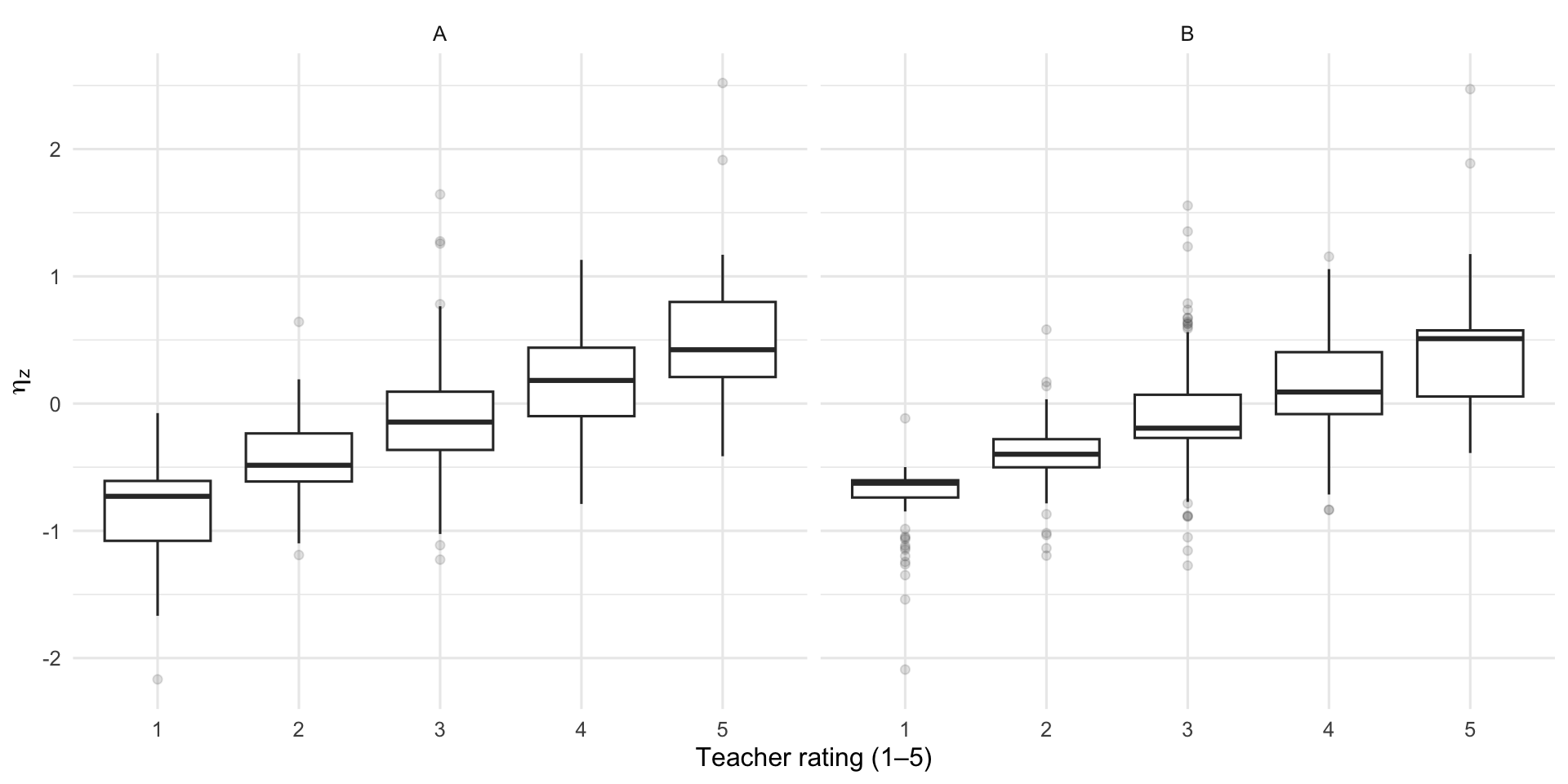 If the model is sensible, students rated higher by their teacher should also have higher estimated attainment. The boxplots should step upward from rating 1 to rating 5. Overlap between adjacent boxes is expected — ratings are coarse.