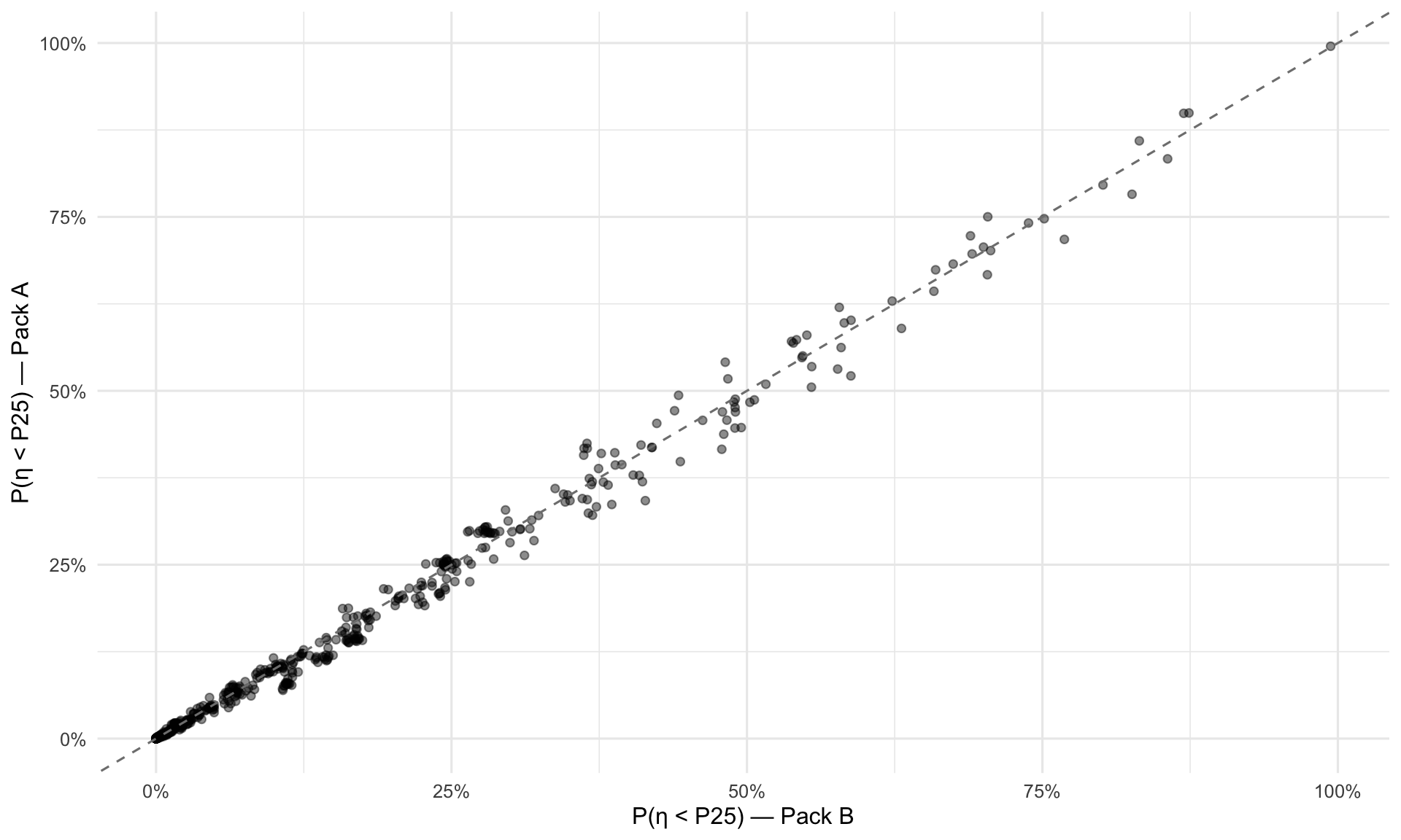 Same as above but for the risk probability. Points in the upper-left or lower-right corners would indicate students whose risk classification flips between packs.