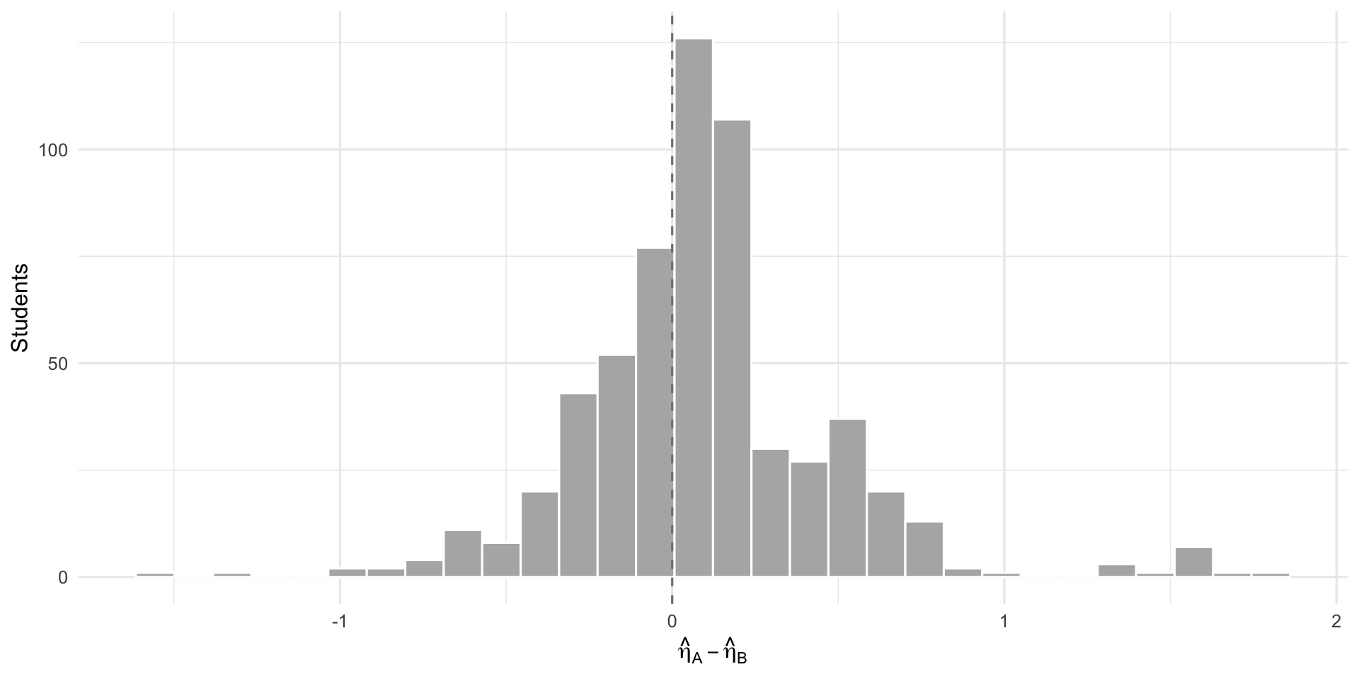 The distribution of Pack A minus Pack B η̂ values. A distribution centred on zero with small spread means the two packs produce practically interchangeable estimates.
