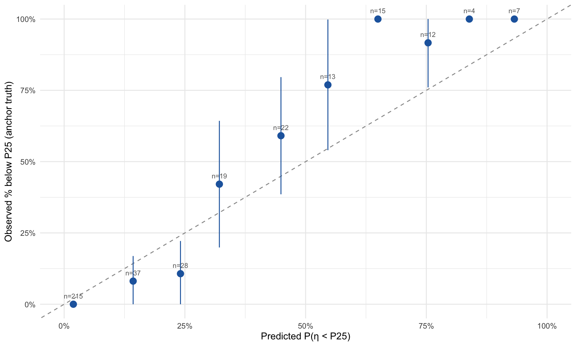 Does the model’s stated probability track observed reality? Below, students are binned by their predicted P(η < P25) and we plot the observed proportion with anchor truth confirming below-P25 status. If the model is well-calibrated, points should lie on the dashed diagonal — e.g., among students the model gives a 40% risk probability, roughly 40% should actually be below P25 according to anchor truth. Points above the diagonal mean the model underestimates risk; below means it overestimates.