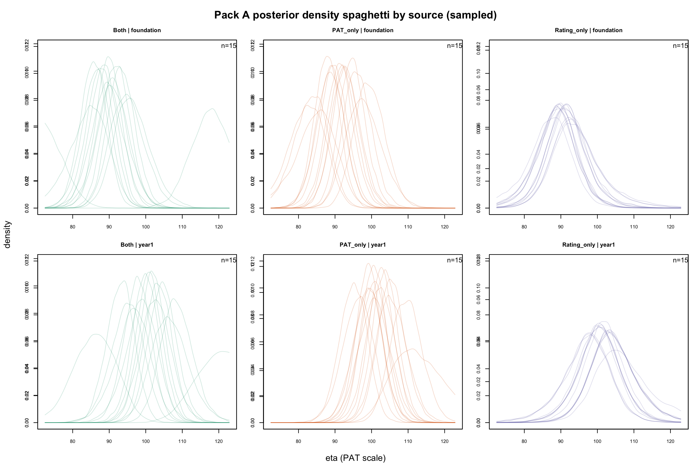 Each translucent curve is one student’s posterior density — the model’s belief about where that student’s true attainment lies. Wider curves mean more uncertainty. Compare across panels: rating-only posteriors (purple) are typically wider than PAT-backed posteriors (orange/green).