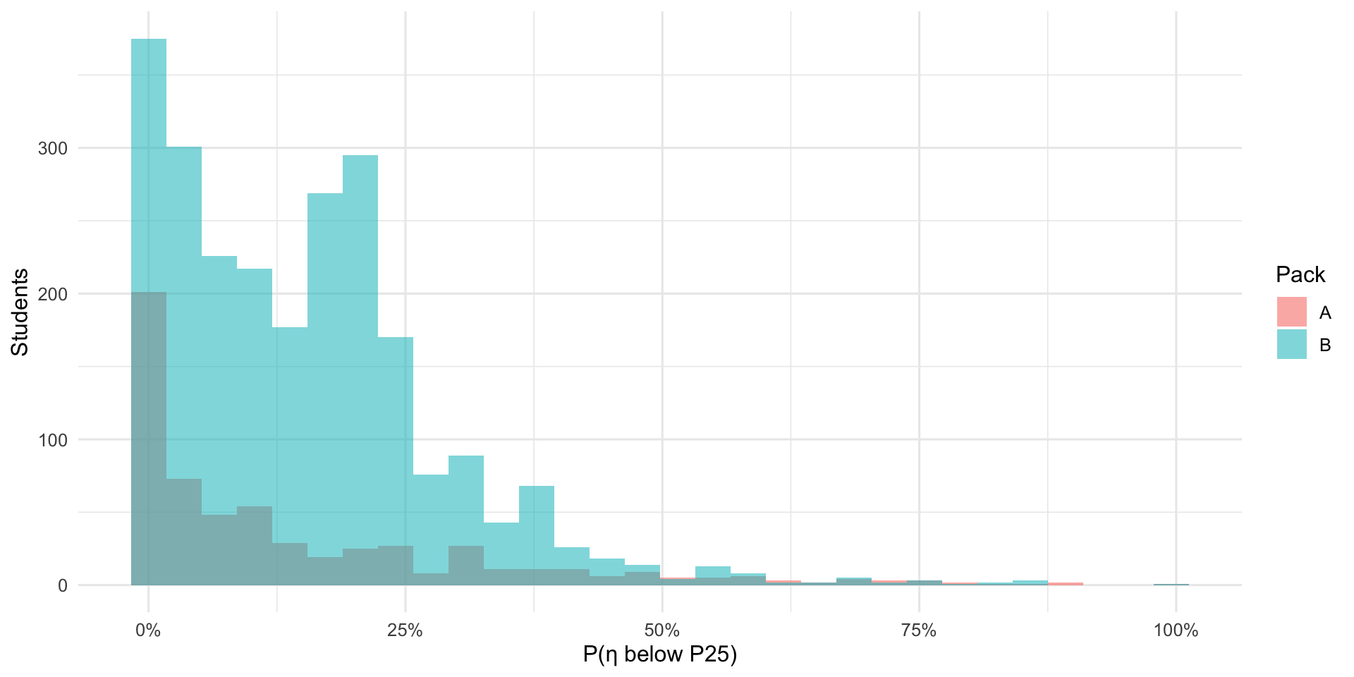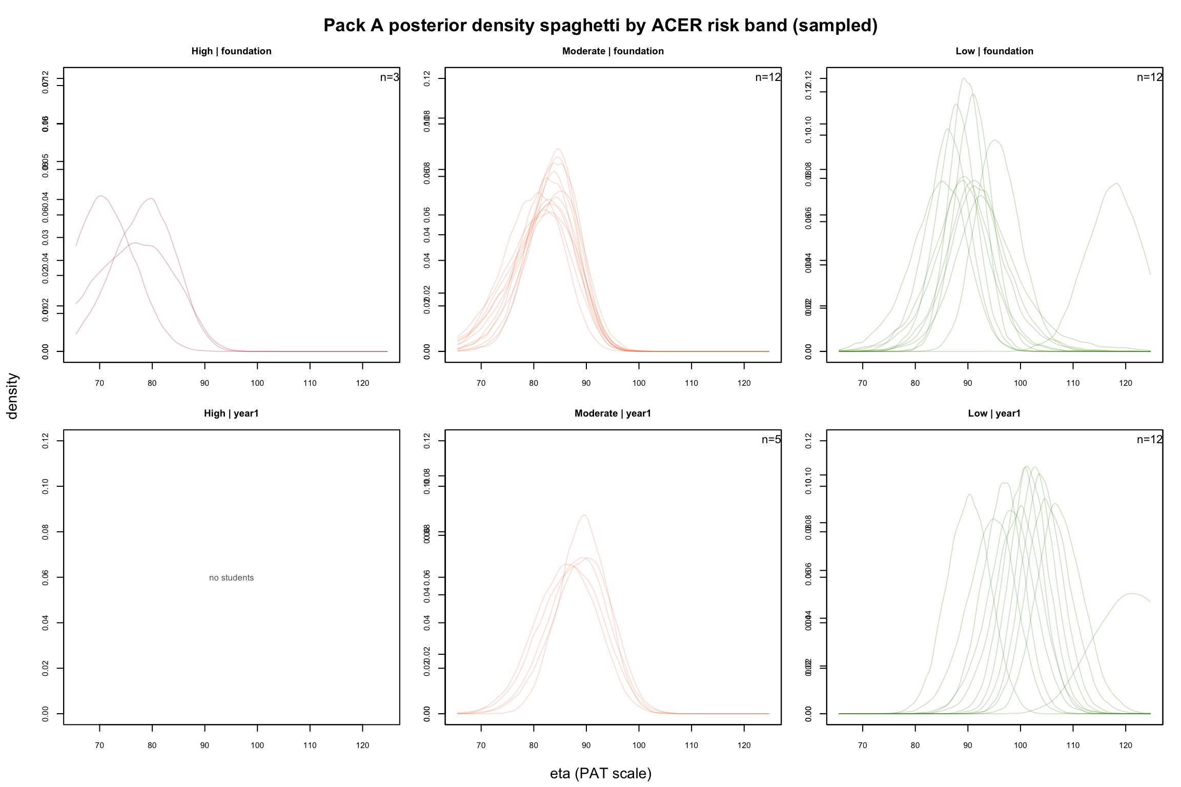 These plots visualise sampled posterior densities for student-level η from the Pack A Bayesian fit. They serve as qualitative diagnostics for posterior shape, separation, and uncertainty — not as a primary reporting view.