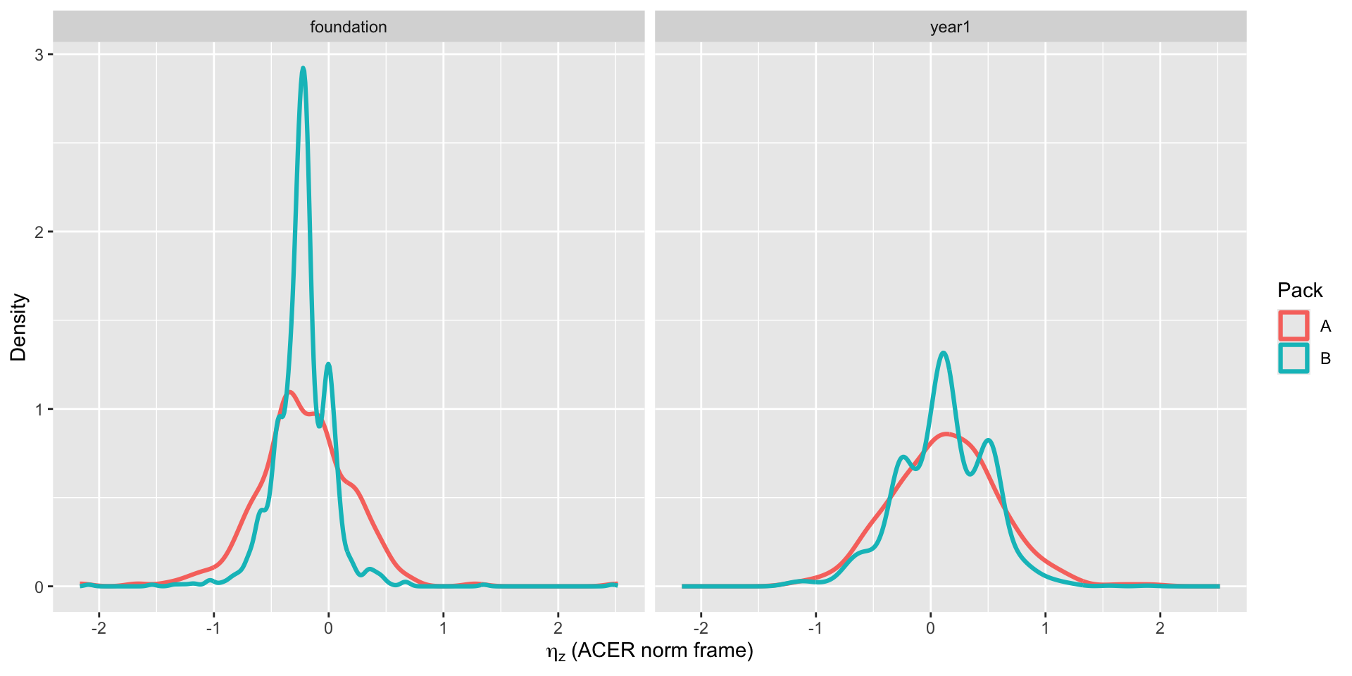This shows the spread of estimated attainment within each year level. ηz is a z-score: 0 means the ACER national average, negative values are below average. Faceting by Foundation and Year 1 avoids pooled-shape artefacts and makes Pack A vs Pack B comparisons interpretable within cohort.