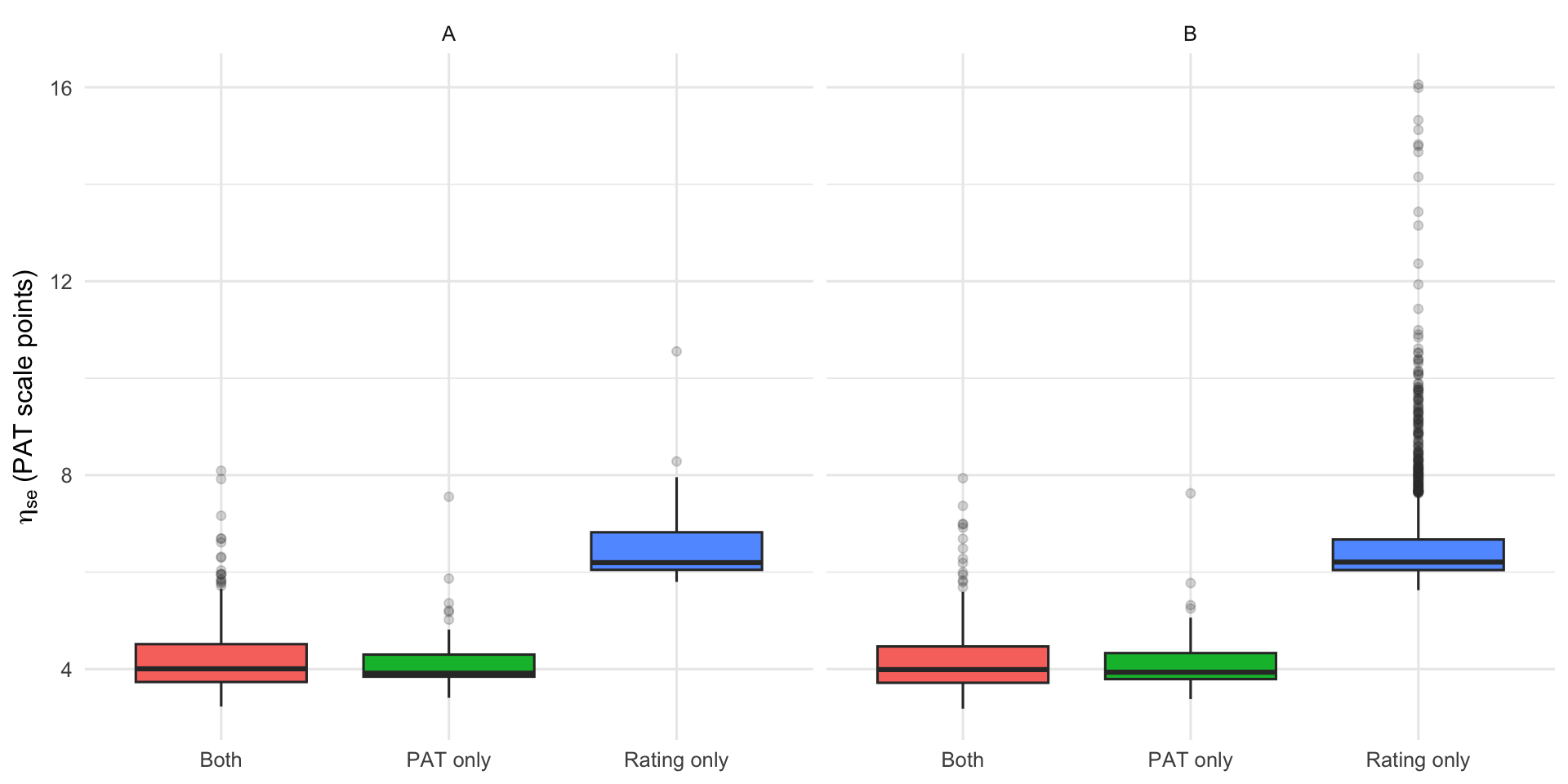 Rating-only students (no PAT score) have higher uncertainty than students with PAT data. Students with both sources (“Both”) tend to have the lowest uncertainty. This plot shows why having PAT data matters for precision — and why Pack B’s additional rating-only students come with a cost in confidence.