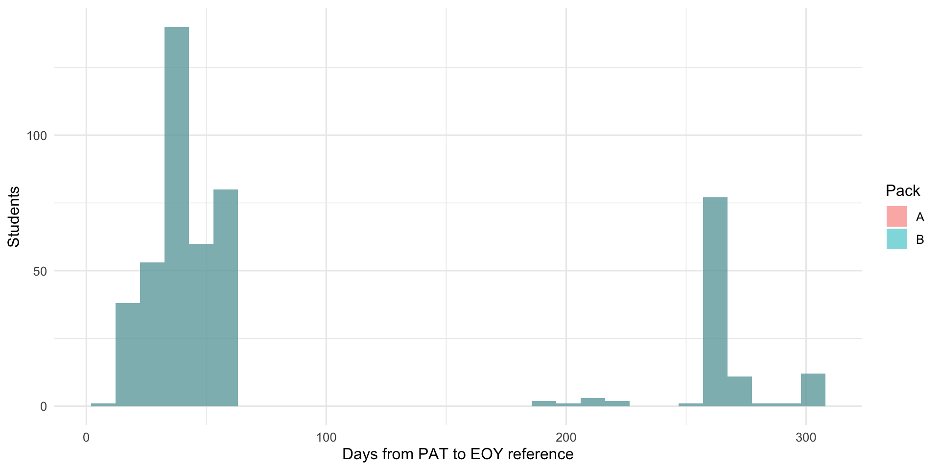PAT tests taken further from the end-of-year reference date carry more uncertainty because students may have grown in the interim. This histogram shows how many days separated each PAT administration from the reference date. A tight cluster near zero is ideal.
